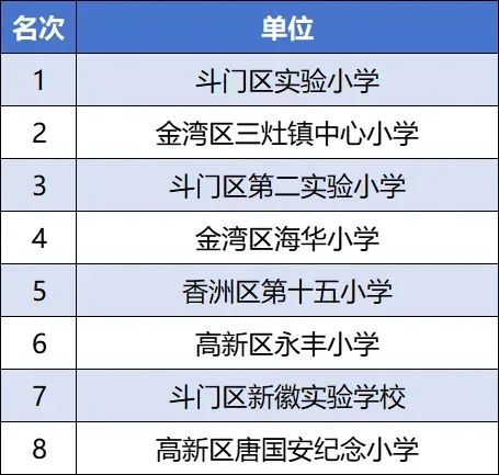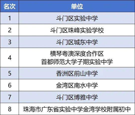 斗门区城东中学 横琴粤澳深度合作区首都师范大学子期实验中学 珠海市南水中学 珠海市金海岸中学 珠海市广东实验中学金湾学校附属初中 珠海市金鼎中学小学组(8个)